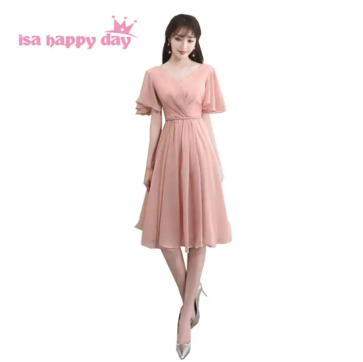 Blush Pink Fashion V Neck Bridesmaid Party Dresses Tea Length Tea Length Dresses With Sleeves For Wedding Guest