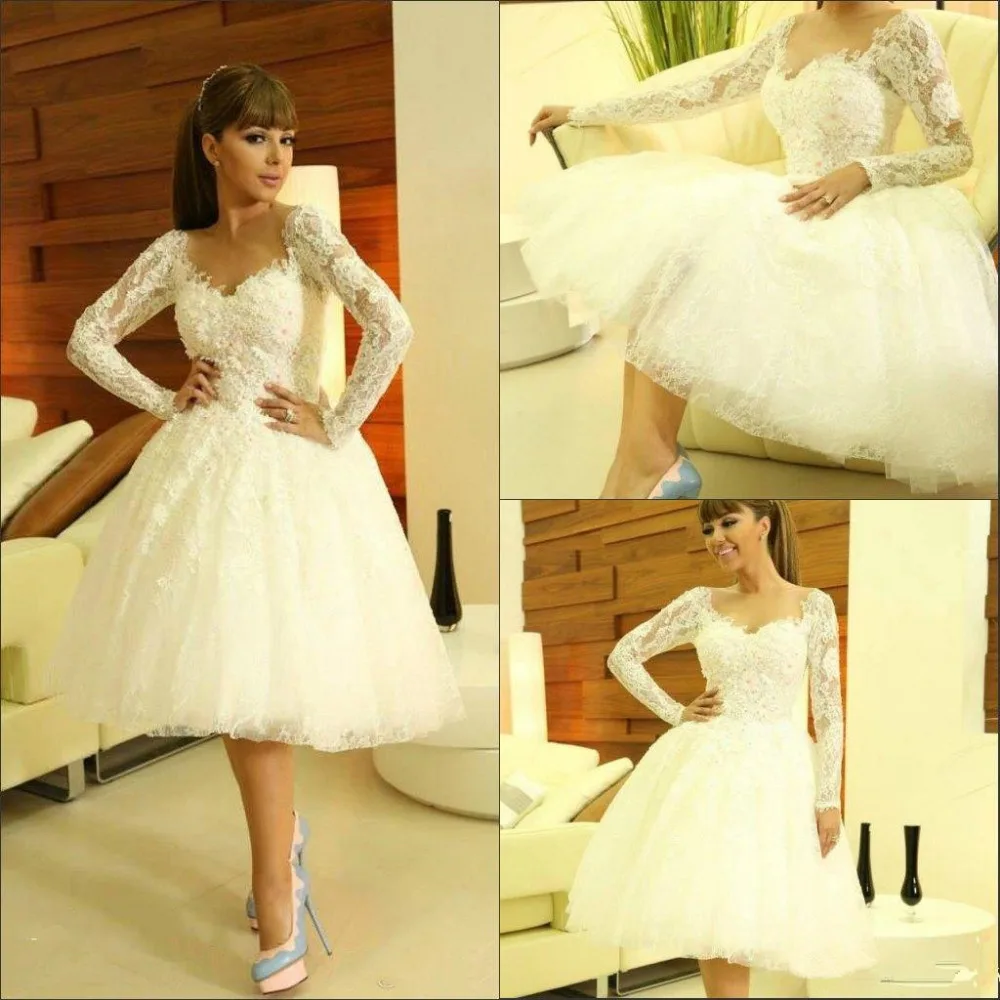 1950s Retro Tea Length Ivory Lace Sleeved Wedding Dress Tea Tea Length Lace Wedding Dresses With Sleeves