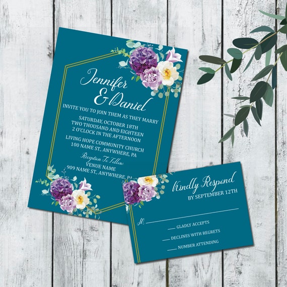 Floral Teal Wedding Invitation And Rsvp Card Teal And White Etsy Teal Invitations Wedding