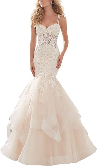 Lovemyth Women S Double Shoulder Straps Lace Appliques Sweetheart Tulle Bottom Wedding Dress