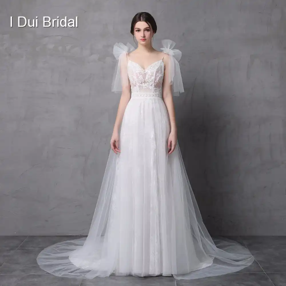 V Neck Spaghetti Strap A Line Wedding Dress With Tiered Tulle Tulle Straps Wedding Dress