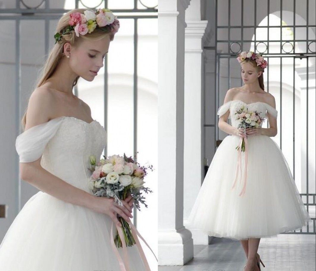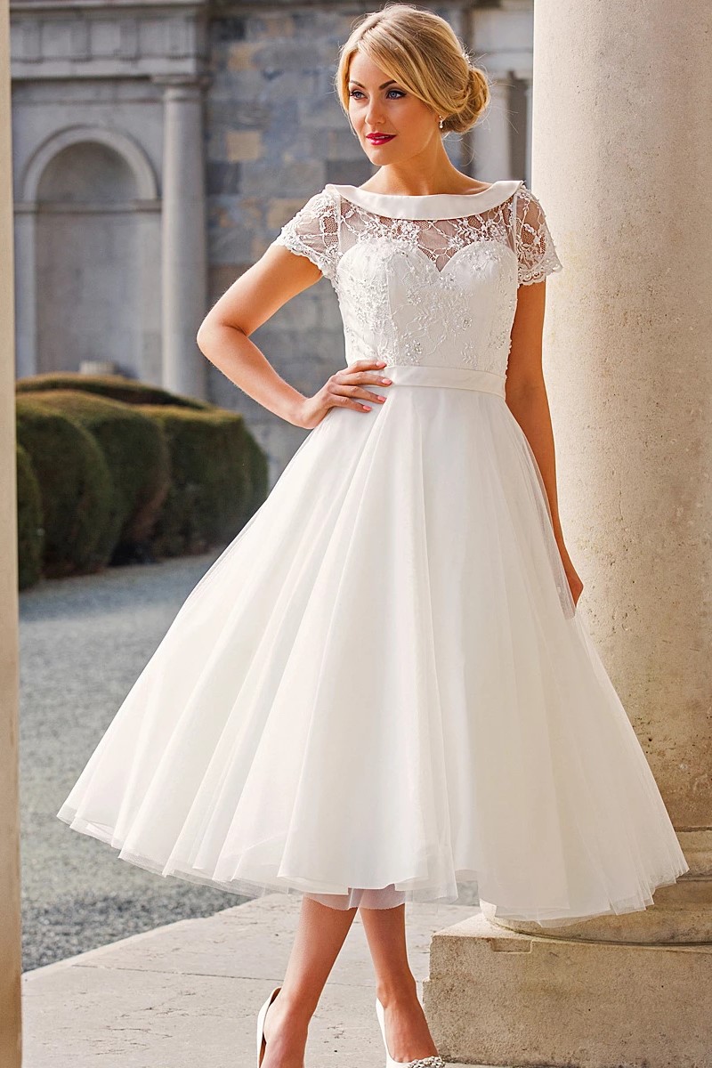Tea Length Wedding Dress With Short Sleeves Tulle Short Bridal Dress 11274 Landress Co Uk Tulle Tea Length Wedding Dress