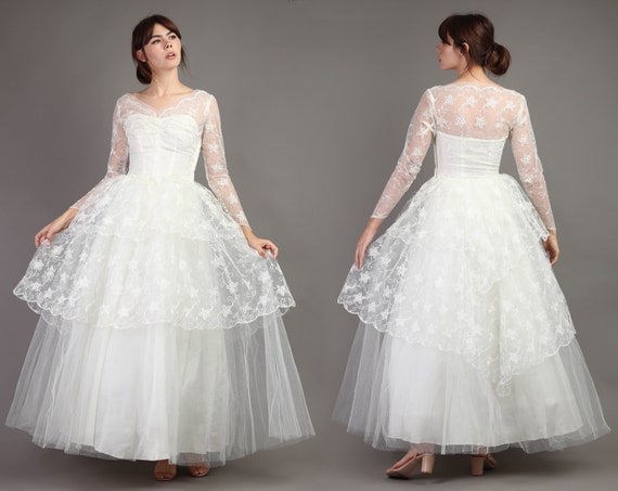 50s Embroidered Tulle Tiered Wedding Gown Xs S White Sheer Etsy Tulle Tiered Wedding Dress