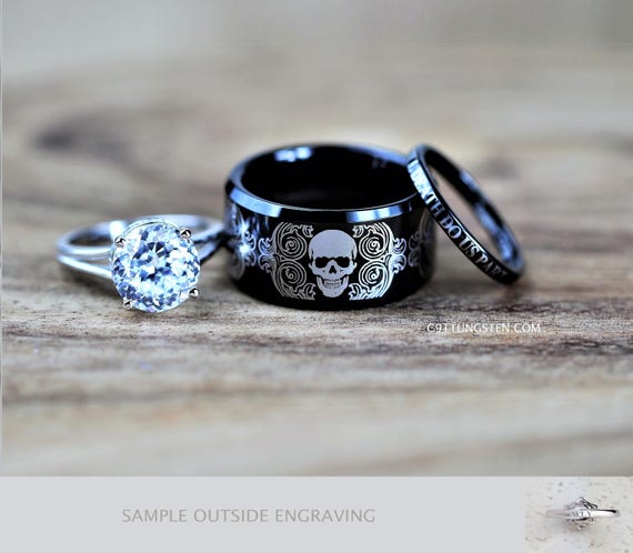 Tungsten Wedding Ring Set Rocker Biker Skull 3 Piece Set Etsy Tungsten Wedding Rings Sets