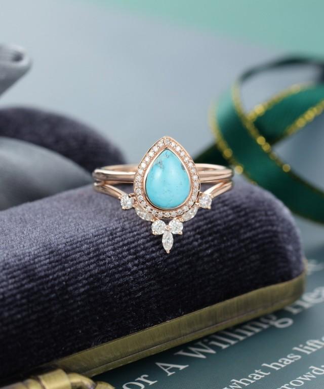2pcs Pear Shaped Turquoise Ring Halo Diamond Engagement Ring Set Rose Gold Vintage Ring Moissanite Wedding Bridal Anniversary Gift For Women 2952122 Weddbook Turquoise And Diamond Wedding Ring