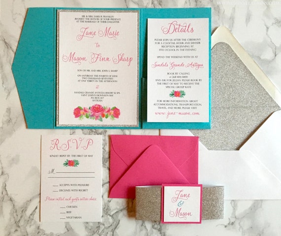 Turquoise Pink And Silver Glitter Pocket Wedding Invitation Etsy Turquoise And Pink Wedding Invitations
