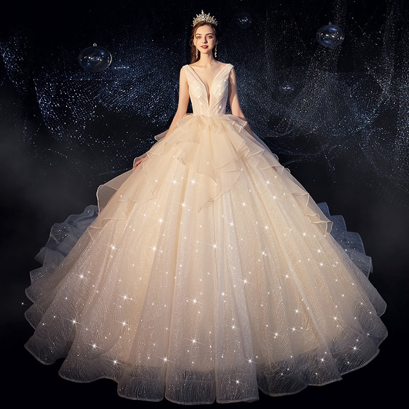 Vivian S Bridal Luxury Shine Starry Sky Ball Gown Wedding Dress V Neck Ball Gown Wedding Dress