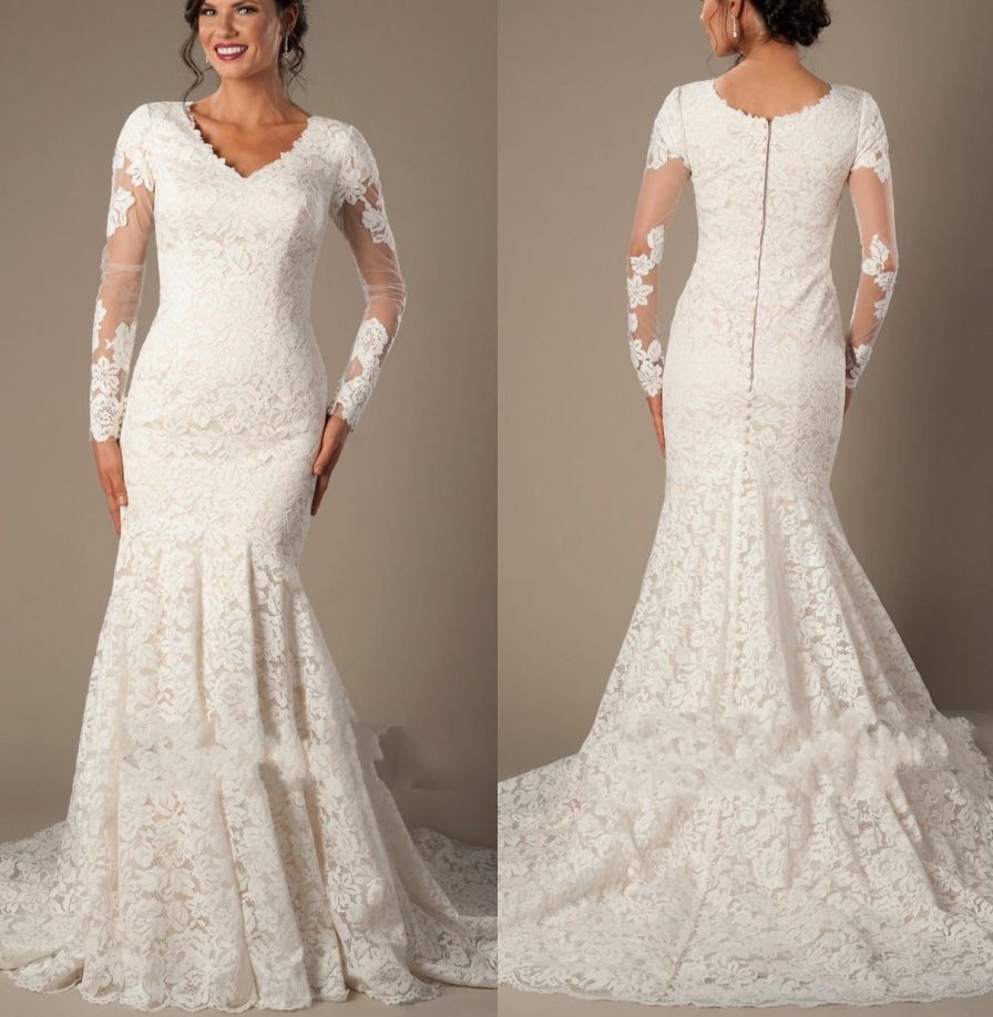 Vintage Champagne Lace Mermaid Modest Wedding Dresses With Long V Neck Fishtail Wedding Dresses
