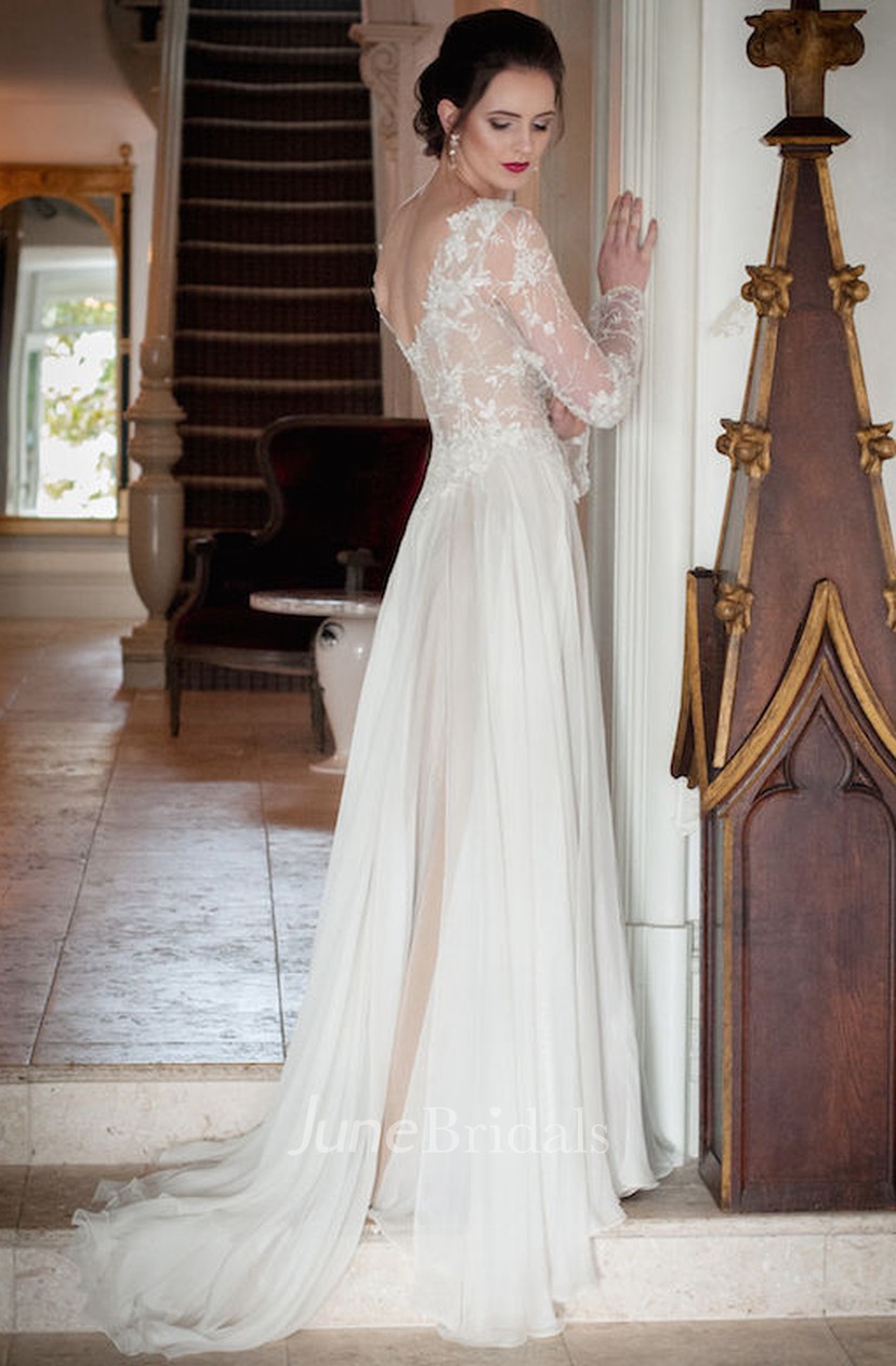 Sheath V Neck Illusion Sleeve Chiffon Wedding Dress June Bridals V Neck Illusion Wedding Dress