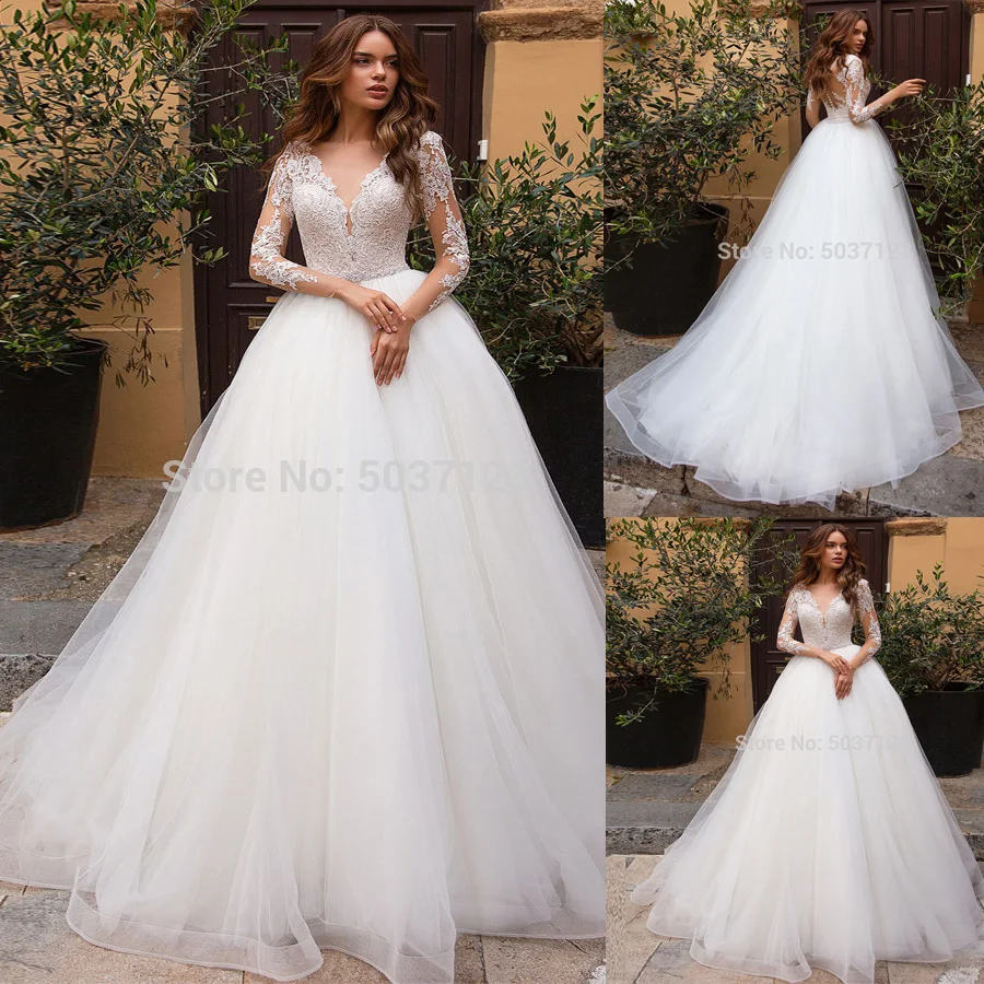 2019 A Line Long Sleeves V Neck Lace Tulle Wedding Gowns Simple V Neck Lace Wedding Dress With Sleeves