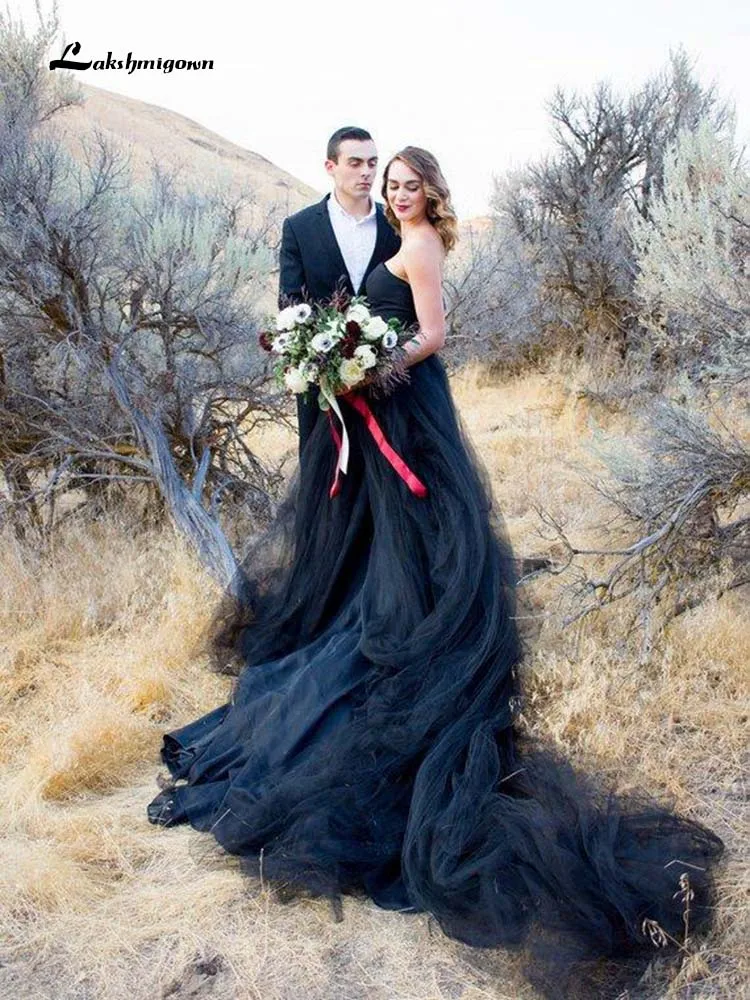 Black Wedding Dress Tulle Strapless Lace Up Back 2020 Gothic Viking Wedding Dress Black