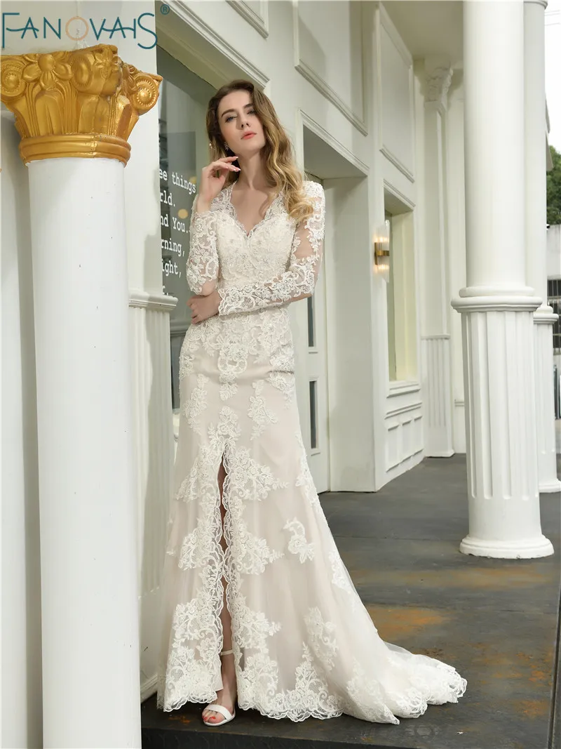 Vintage Champagne Wedding Dress 2019 Long Sleeves Lace Wedding Vintage Champagne Lace Wedding Dress