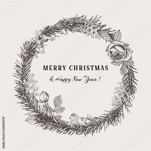 Christmas Wreath Christmas Round Background In Vintage Style Greeting Invitation Card Botanical Illustration With Roses Spruce Branches Fir Cones Winter Wedding Invitation Black And White Buy This Stock Vector And Explore Vintage Christmas Wedding Invitations