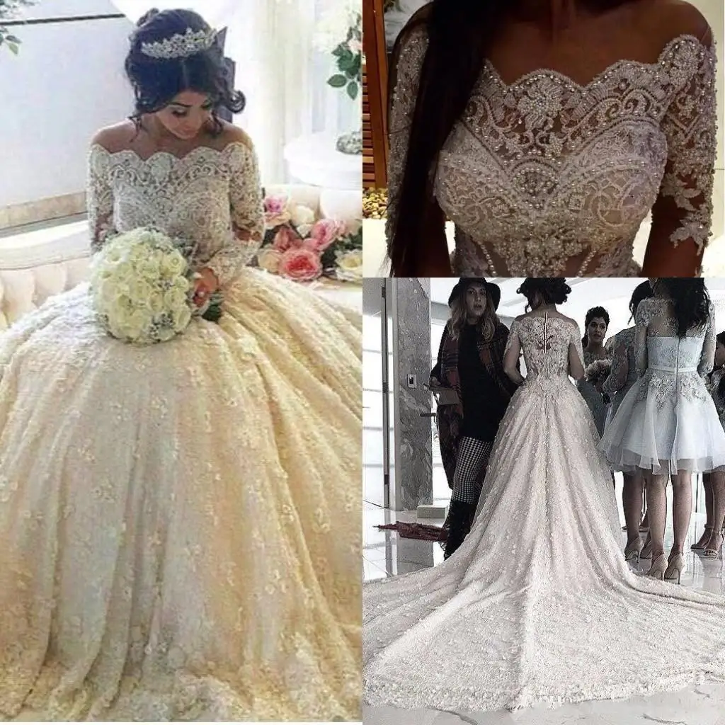 H S Bridal Wedding Dresses Long Sleeved 2019 Off The Shoulder Vintage Lace Ball Gown Wedding Dress