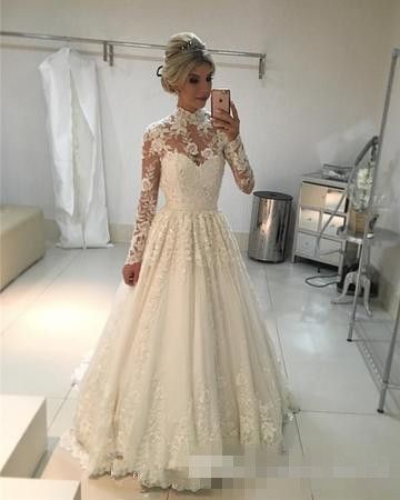 Vintage Retro Champagne See Through Wedding Dresses 2020 Ball Vintage Lace High Neck Wedding Dress