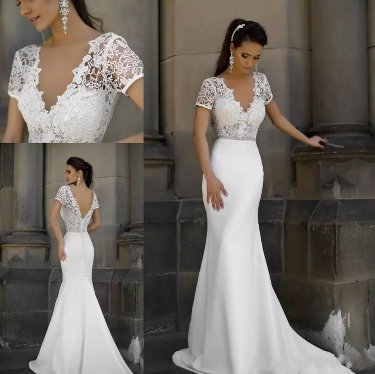 2019 Vintage Mermaid Wedding Dresses Short Sleeves V Neck Lace Vintage Mermaid Wedding Dress