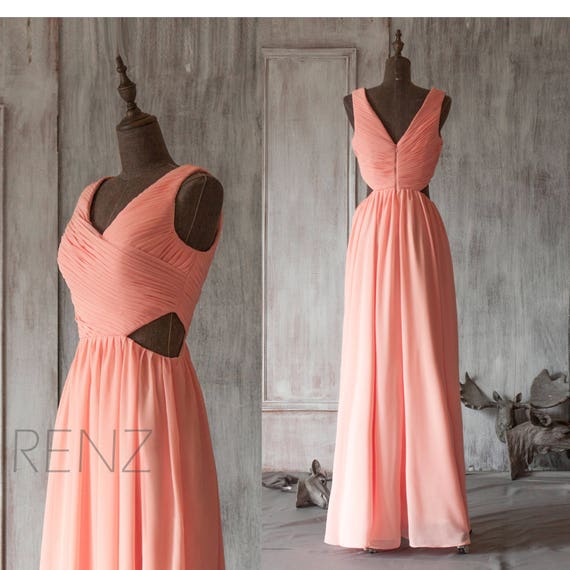 Bridesmaid Dress Light Coral Chiffon Wedding Dress Deep V Neck Etsy Wedding Coral Maxi Dress