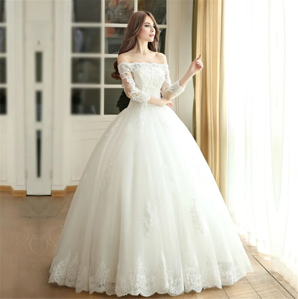 2016 Lace Beaded Ball Gown Wedding Dresses Boat Neck 3 4 Sleeve Wedding Dress 3 4 Sleeve Lace