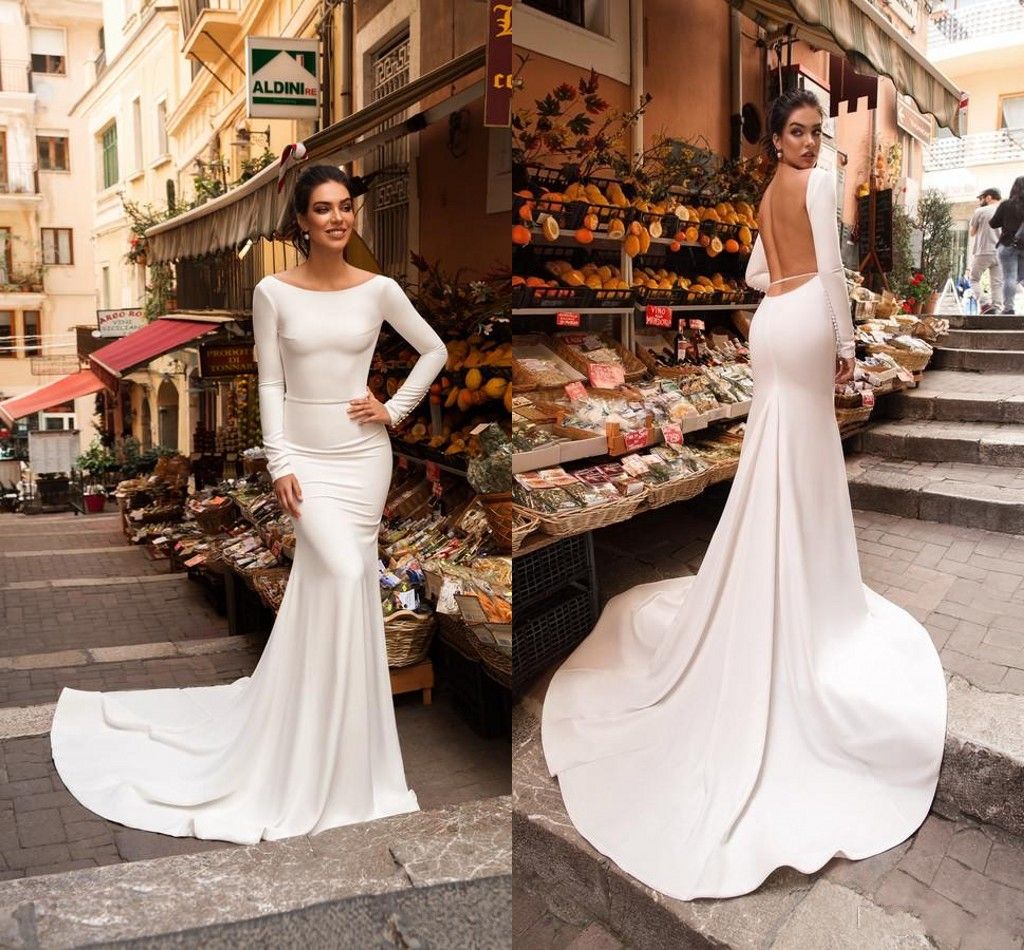 2019 Mermaid Wedding Dresses Satin Backless Jewel Neck Sweep Train Wedding Dress Backless Long Sleeve