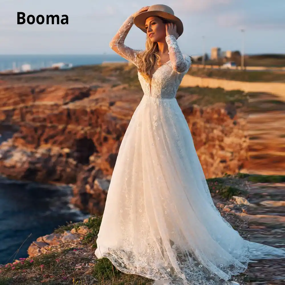 China Lace Long Sleeves Wedding Gowns Beading Boho Beach Bridal Wedding Dress Boho Sleeves