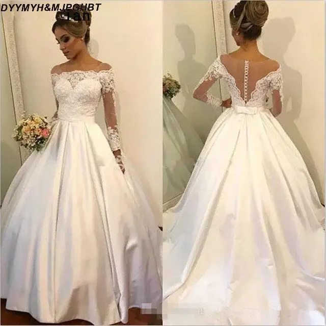 Tulle Floor Length A Line Princess Long Sleeve Off The Shoulder Wedding Dress Covering Shoulders