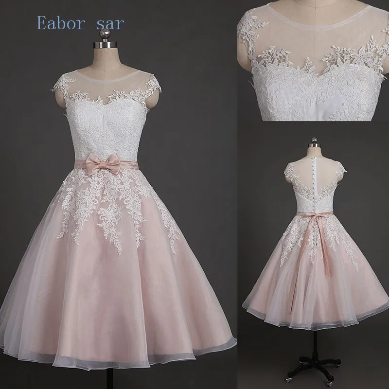 Champagne Lace Applique Wedding Dress 50s Vintage Knee Length Ball Wedding Dress For Short Brides