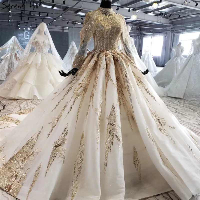 Dubai Luxury Beading Tassel Wedding Dresses 2020 Gold White Long Wedding Dress Gold And White