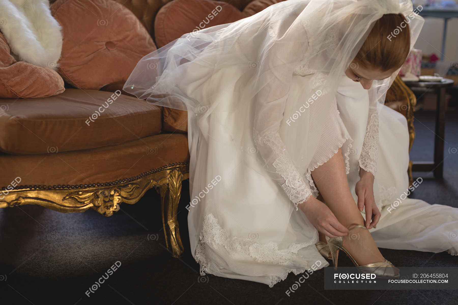Bride In Wedding Dress Wearing High Heels At Boutique Life Event Wedding Dress Heels