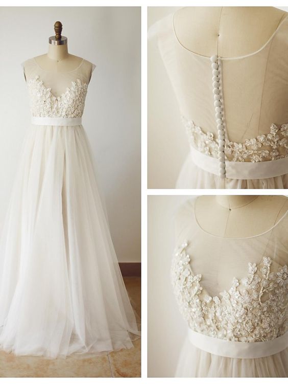 Tulle Jewel Neckline A Line Wedding Dresses With Illusion Back Wedding Dress Illusion Back