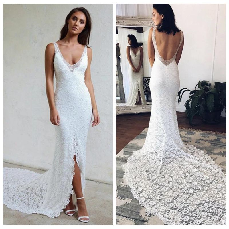 Elegant V Neck Lace Backless Wedding Dresses With Court Train Sheath Wedding Dresses High Slit Lace Wedding Gown Corona Nupcial Y Tiaras Wedding Dresses With Lace Back Wedding Gowns Under 1000 From Wedding Dress Lace Backless