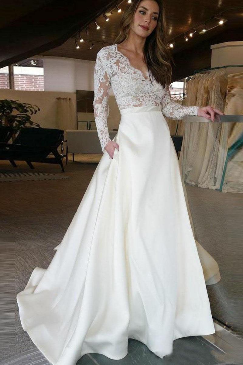 Shop White V Neck Lace Bodice A Line Wedding Dress With Chapel Wedding Dress Lace Bodice