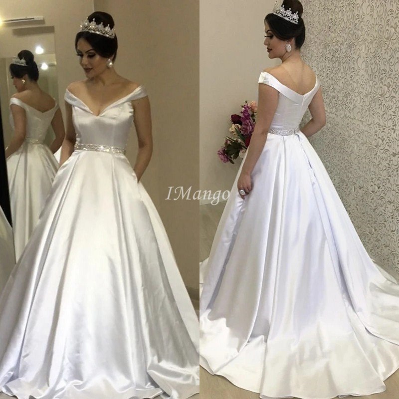 Elegant White Satin Ball Gown Plus Size Wedding Dress With Pockets 2020 Off Shoulder Luxury Chapel Train Wedding Gowns Turkey Wedding Dresses Aliexpress Wedding Dress Pockets Ball Gown