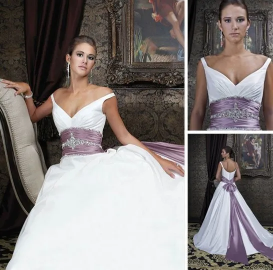 Purple And White Wedding Dresses V Neck Beading Waistline Long Bow Wedding Dress Purple Sash