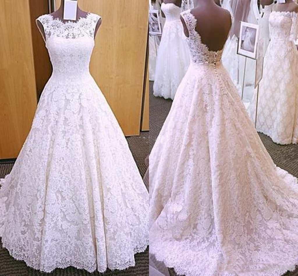 Discount Wedding Dresses 2019 Vintage Cap Sleeves Open Back Lace A Line Cover Button Full Lace Bridal Gown Custom Made Vestidos De Novia Princess Line Wedding Dress Simple A Line Wedding Dresses Wedding Dress Shipping