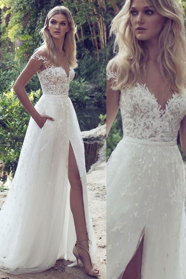 Long Sleeve Lace Wedding Dress Sexy Slit V Back Wedding Dress Wedding Dress Slit