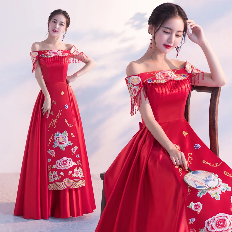 Red Off Shoulder Chinese Traditional Wedding Dress Women Elegance Satin Cheongsam Oriental Bride Dresses Party Qipao Tang Cloth Cheongsams Aliexpress Wedding Dress Stores In Ma