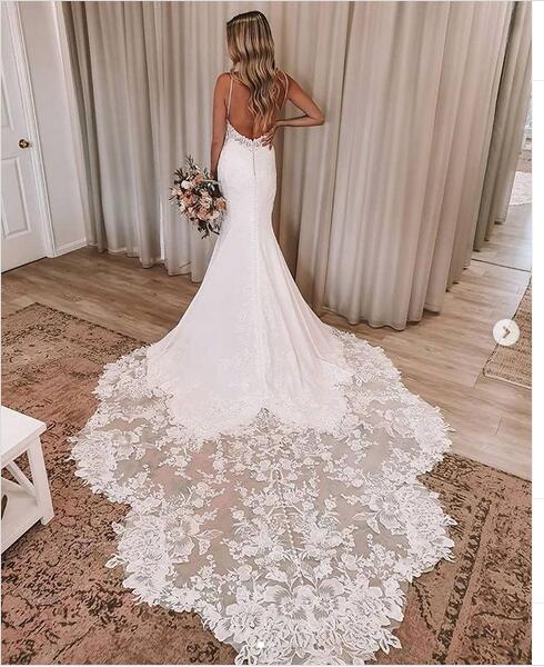 Fenghuavip Spaghetti Straps Wedding Dress Lace Appliques Long Train Beach Bride Gowns At Amazon Women S Clothing Store Wedding Dress Straps Lace