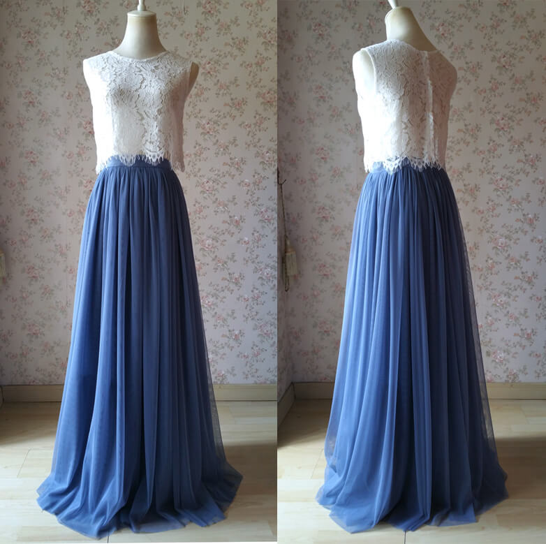 Dusty Blue Tulle Skirt Two Piece Bridesmaid Dress Dusty Blue Long Tulle Skirt Sleeveless Crop Lace Top Boho Wedding Bridesmaid Outfit S028 Dressromantic Online Store Powered By Storenvy Wedding Dress Tulle Skirt Lace Top