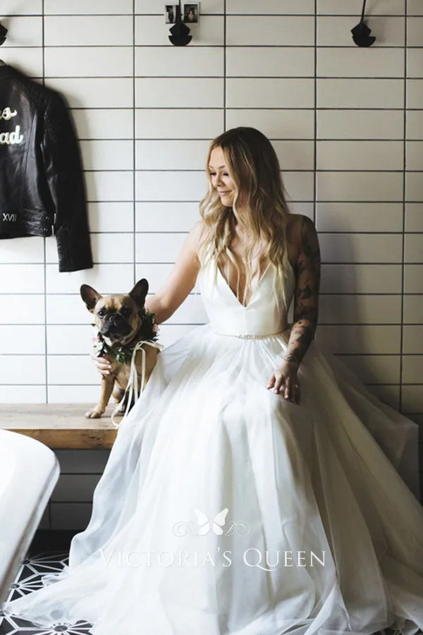 Ivory Tulle Deep V Neck Spaghetti Strap Wedding Dress Vq Wedding Dress V Neck A Line