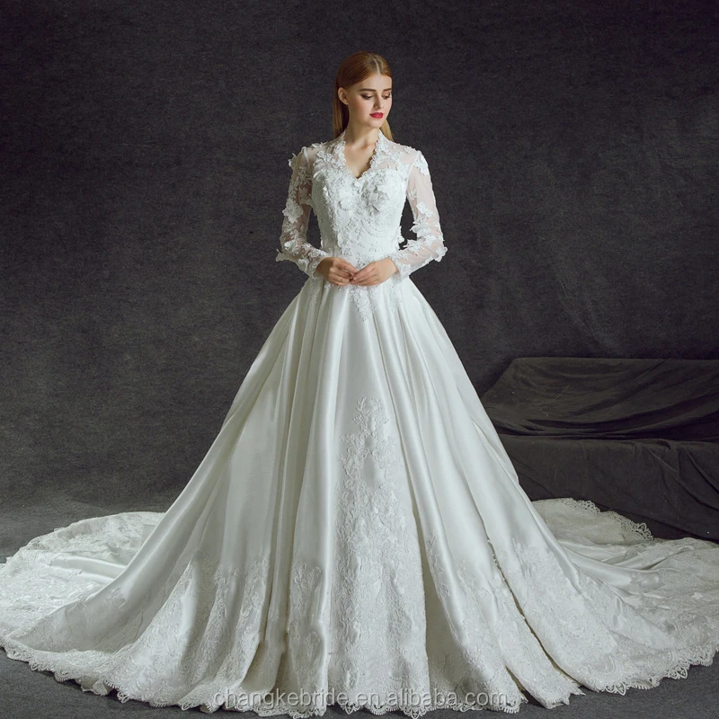 Muslim New Pattern Wedding Dress Applique Satin Princess Long Wedding Dress With Applique