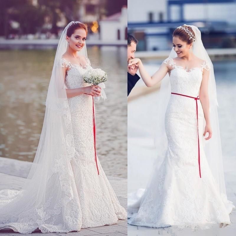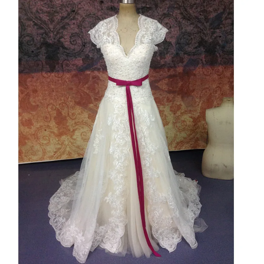 2017 Modest Design Red Sash Wedding Dresses Cap Sleeve V Neck Wedding Dress With Red Sash