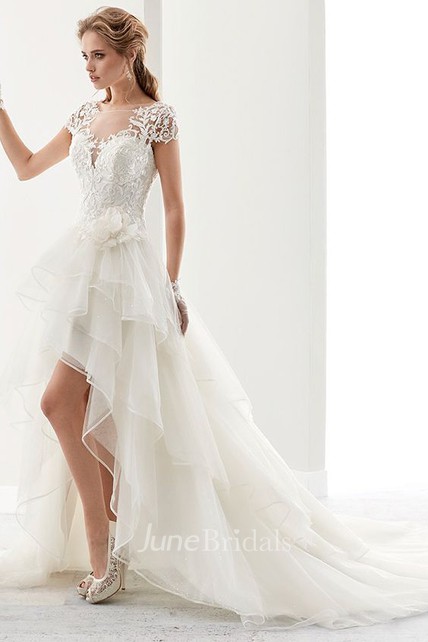 Illusion Jewel Neck High Low Bridal Gown With Ruffles And T Shirt Sleeves June Bridals Wedding Dress With T Shirt Sleeves