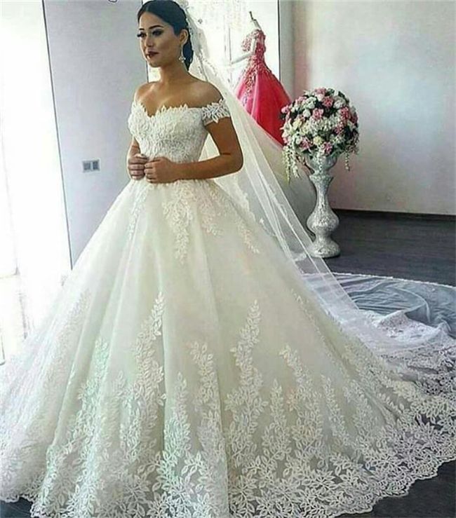 A Line Spaghetti Strap Chapel Train Tulle Appliqued Wedding Wedding Dresses Chapel Train