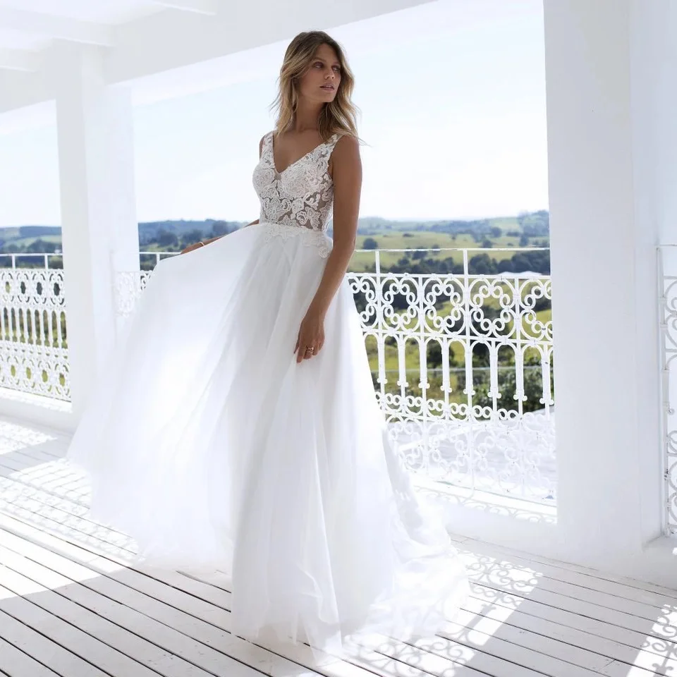 Elegant White Ivory Tulle Boho Beach Wedding Dresses 2019 V Neck Wedding Dresses For Beach Ceremony