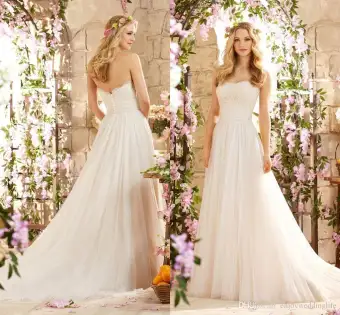 2018 Vintage Summer Beach Lace Strapless A Line Organza Tulle Wedding Dresses Lace Strapless