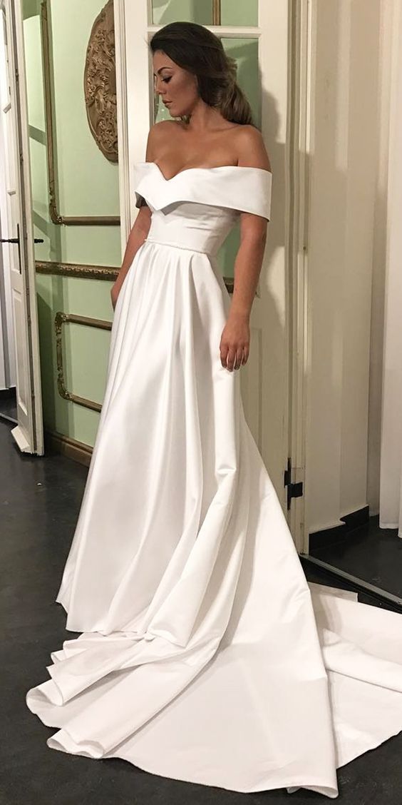 Off Shoulder Long A Line Satin Simple Wedding Dresses Wd0302 Sofiebridal Wedding Dresses Off The Shoulder Satin