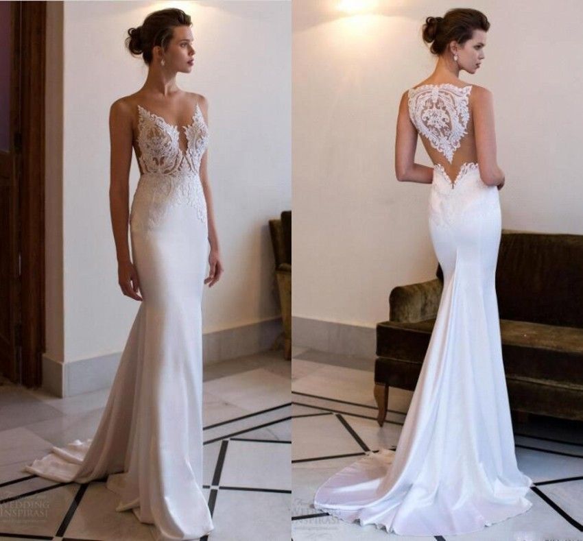 2019 Sexy Sheer Illusion Back Beach Wedding Dresses Lace Appliqued Mermaid Sheath Style Court Train Bridal Gowns Wedding Dresses Sheath Style
