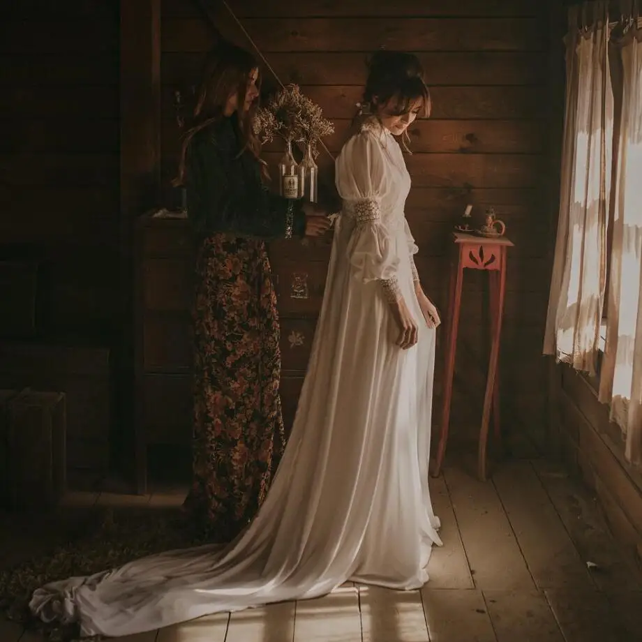Far Western Victorian Style Bohemian Wedding Dresses Long Sleeve High Neck Chiffon Bridal Gowns Amazing Beauty Wedding Dresses Victorian