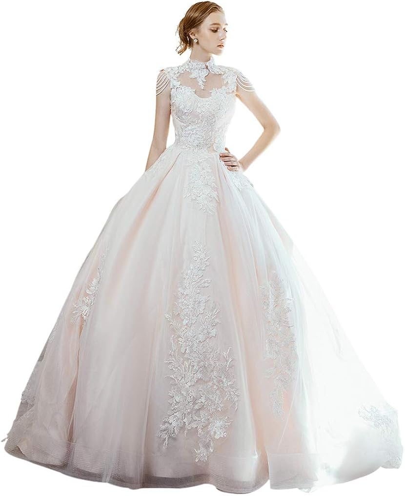 Ynqnfs Bride Wedding Dress Champagne Floor Length Big Train Sleeveless With Pearl Shoulder Beaded Top Lace Floral Wedding Dresses With Big Trains