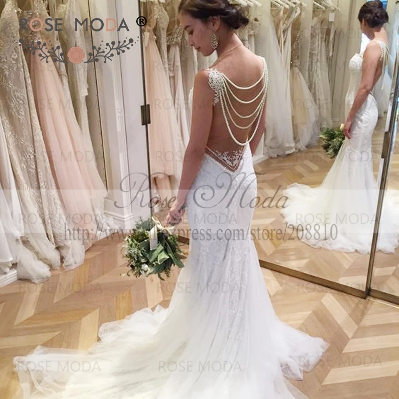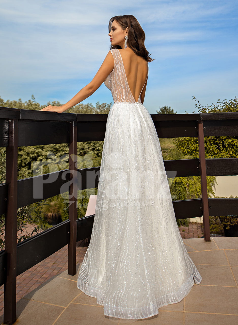 Floor Length Pearl White Tulle Wedding Gown With Glam Sheer Bodice Wedding Dresses With Pearls On The Back